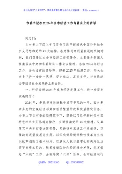 / 市委书记在2025年全市经济工作部署会上的讲话