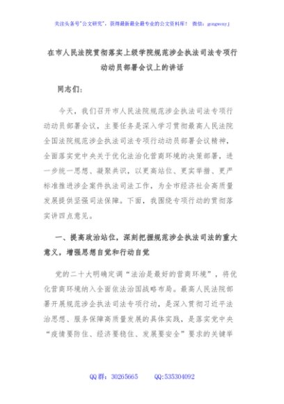 / 在市人民法院贯彻落实上级学院规范涉企执法司法专项行动动员部署会议上的讲话