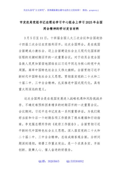 / 市发改局党组书记在理论学习中心组会上学习2025年全国两会精神的研讨发言材料