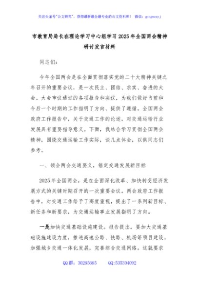 / 市教育局局长在理论学习中心组学习2025年全国两会精神研讨发言材料