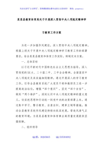 / 某某县教育体育局关于开展深入贯彻中央八项规定精神学习教育工作方案