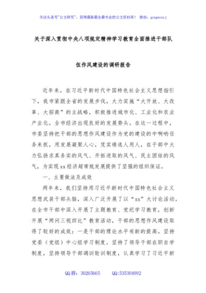 / 关于深入贯彻中央八项规定精神学习教育全面推进干部队伍作风建设的调研报告