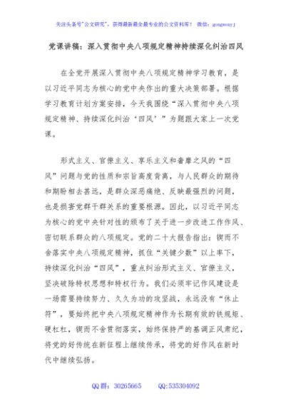 / 党课讲稿:深入贯彻中央八项规定精神持续深化纠治四风