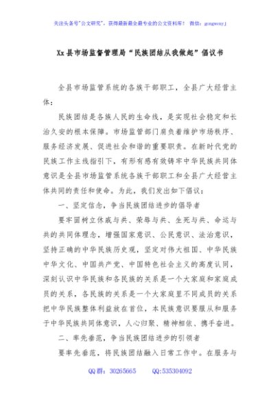 / Xx县市场监督管理局“民族团结从我做起”倡议书
