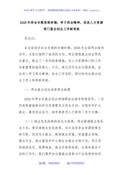 / 2025年两会专题党课讲稿:学习两会精神,促进人力资源部门就业创业工作新突破