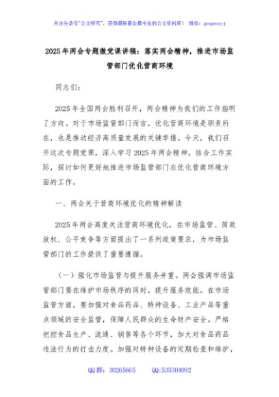 / 2025年两会专题微党课讲稿:落实两会精神,推进市场监管部门优化营商环境