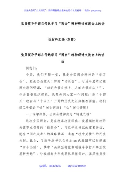 / (5篇)党员领导干部在传达学习“两会”精神研讨交流会上的讲话材料汇编