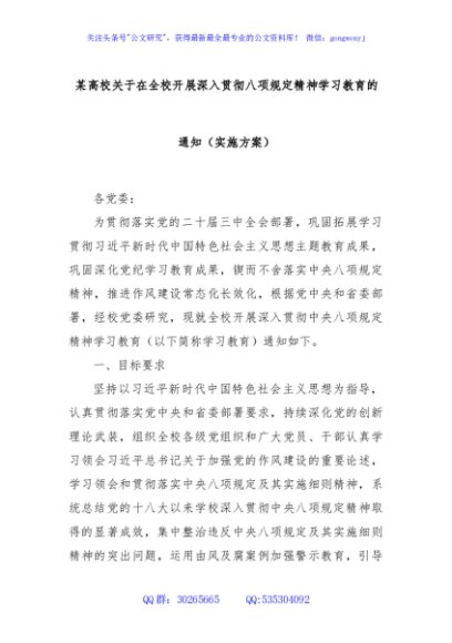 / 某高校关于在全校开展深入贯彻八项规定精神学习教育的通知(实施方案)