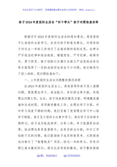 / 班子2024年度组织生活会“四个带头”班子对照检查材料