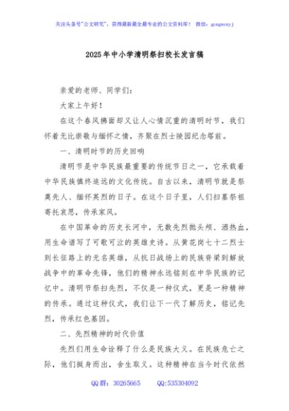 / 2025年中小学清明祭扫校长发言稿