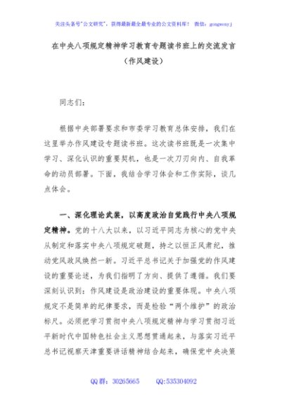 / 在中央八项规定精神学习教育专题读书班上的交流发言(作风建设)