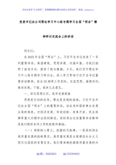 / 党委书记在公司理论学习中心组专题学习全国“两会”精神研讨交流会上的讲话