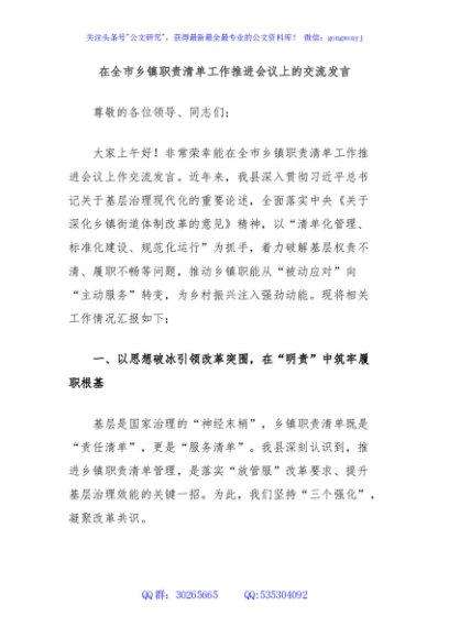 / 在全市乡镇职责清单工作推进会议上的交流发言