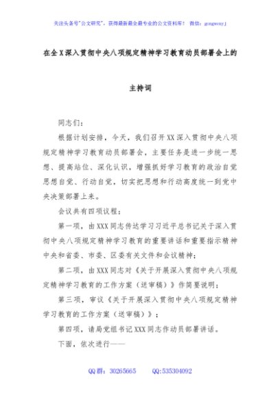 / 在全X深入贯彻中央八项规定精神学习教育动员部署会上的主持词