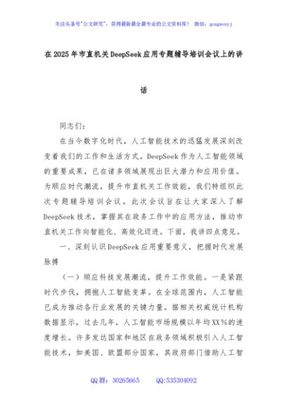 / 在2025年市直机关DeepSeek应用专题辅导培训会议上的讲话