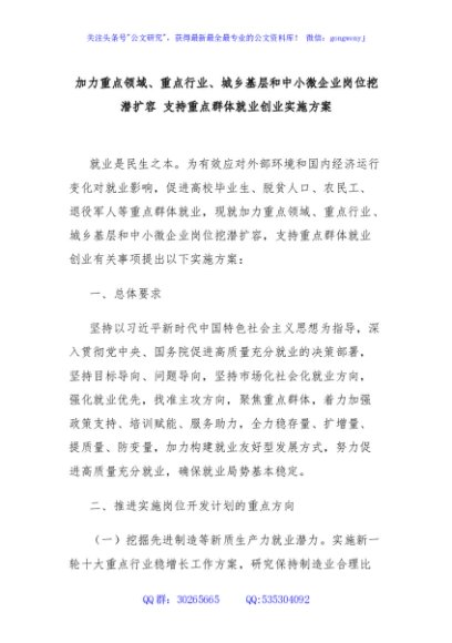 / 加力重点领域、重点行业、城乡基层和中小微企业岗位挖潜扩容 支持重点群体就业创业实施方案
