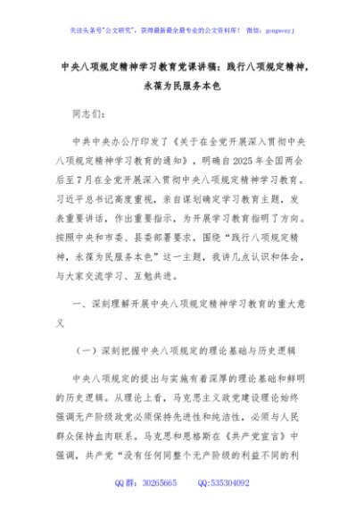 / 中央八项规定精神学习教育党课讲稿:践行八项规定精神,永葆为民服务本色
