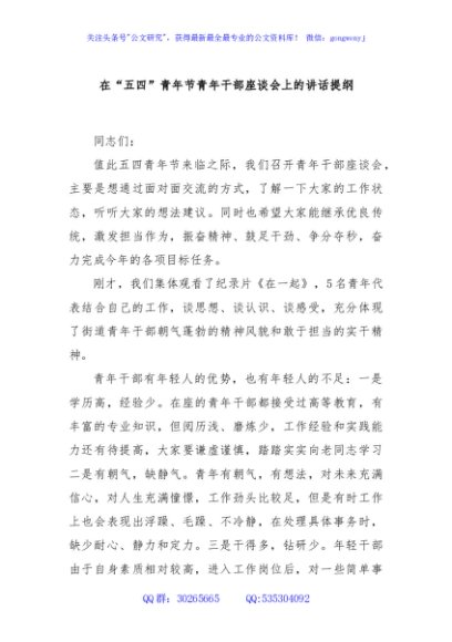 / 在“五四”青年节青年干部座谈会上的讲话提纲