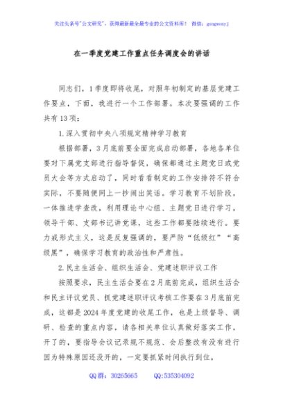 / 在一季度党建工作重点任务调度会的讲话