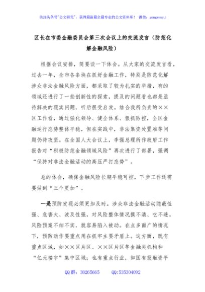 / 区长在市委金融委员会第三次会议上的交流发言(防范化解金融风险)
