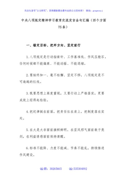 / 中央八项规定精神学习教育交流发言金句汇编(四个方面75条)