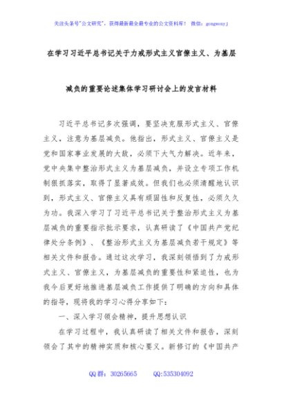 / 在学习习近平总书记关于力戒形式主义官僚主义、为基层减负的重要论述集体学习研讨会上的发言材料