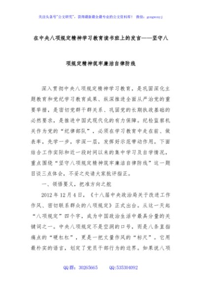 / 在中央八项规定精神学习教育读书班上的发言——坚守八项规定精神筑牢廉洁自律防线
