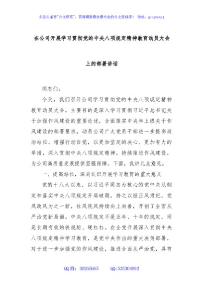 / 在公司开展学习贯彻党的中央八项规定精神教育动员大会上的部署讲话
