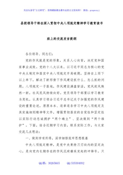 / 县级领导干部在深入贯彻中央八项规定精神学习教育读书班上的交流发言提纲