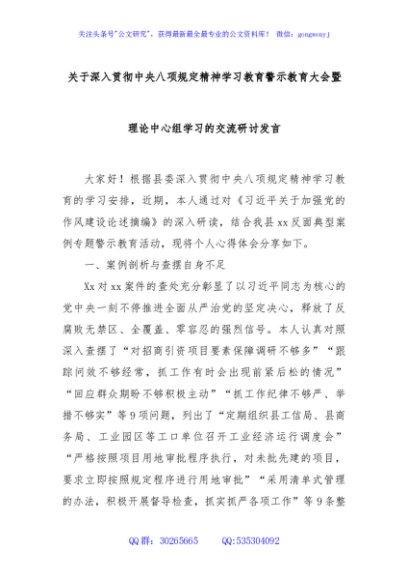 / 关于深入贯彻中央八项规定精神学习教育警示教育大会暨理论中心组学习的交流研讨发言