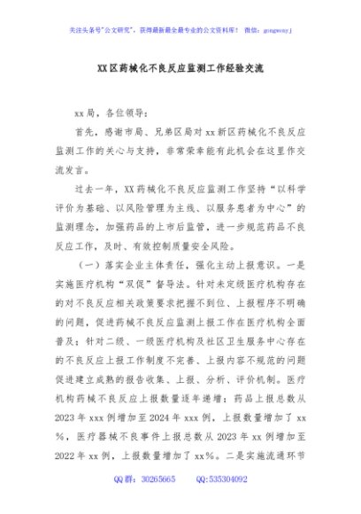 / XX区药械化不良反应监测工作经验交流