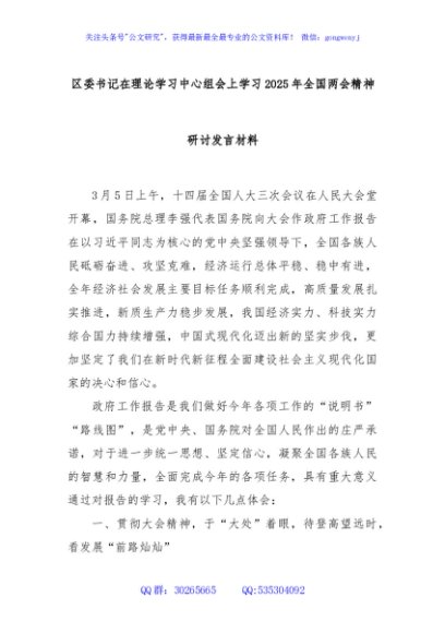 / 区委书记在理论学习中心组会上学习2025年全国两会精神研讨发言材料
