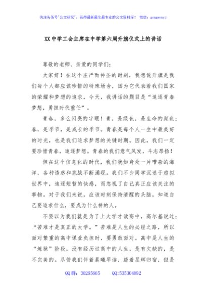 / XX中学工会主席在中学第六周升旗仪式上的讲话