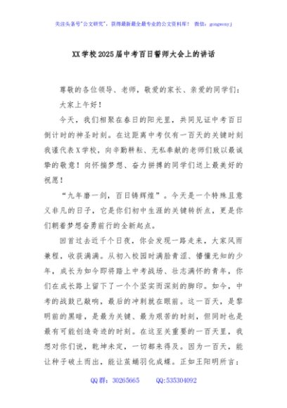 / XX学校2025届中考百日誓师大会上的讲话