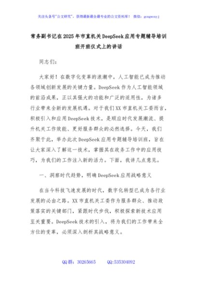 常务副书记在2025年市直机关DeepSeek应用专题辅导培训班开班仪式上的讲话