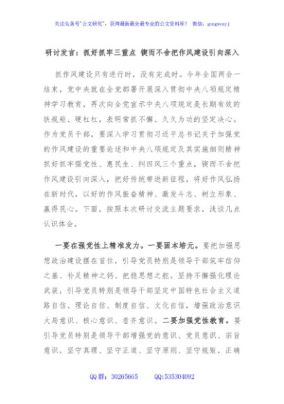 / 研讨发言:抓好抓牢三重点 锲而不舍把作风建设引向深入
