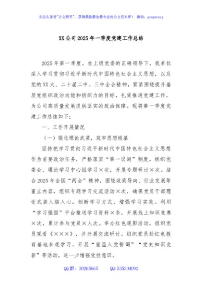 / XX公司2025年一季度党建工作总结