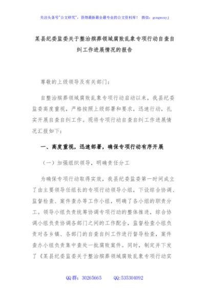 / 某县纪委监委关于整治殡葬领域腐败乱象专项行动自查自纠工作进展情况的报告