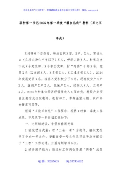/ 驻村第一书记2025年第一季度“擂台比武”材料(五比五争先)