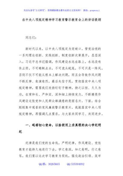 / 在中央八项规定精神学习教育警示教育会上的讲话提纲