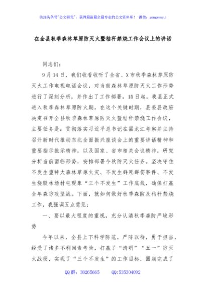 / 在全县秋季森林草原防灭火暨秸秆禁烧工作会议上的讲话
