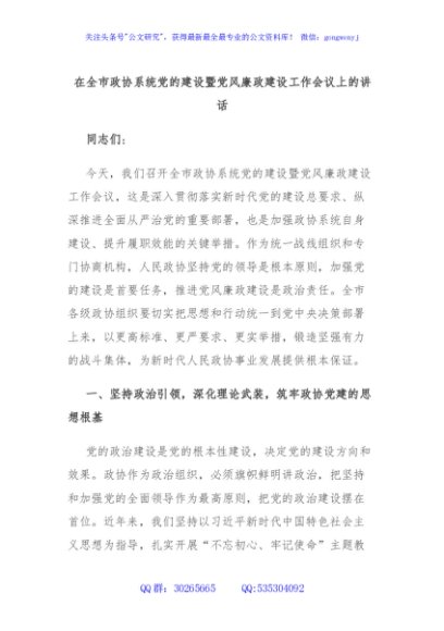 / 在全市政协系统党的建设暨党风廉政建设工作会议上的讲话