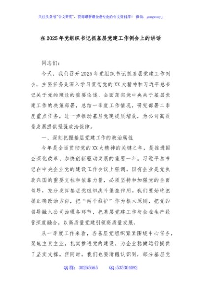 / 在2025年党组织书记抓基层党建工作例会上的讲话