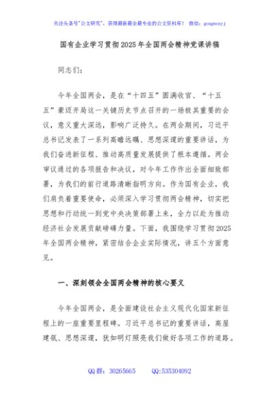 / 国有企业学习贯彻2025年全国两会精神党课讲稿