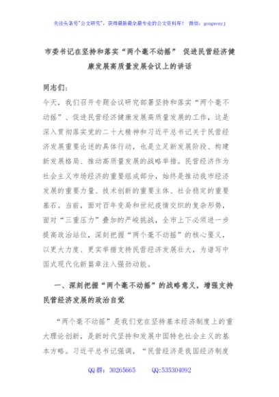 / 市委书记在坚持和落实“两个毫不动摇” 促进民营经济健康发展高质量发展会议上的讲话