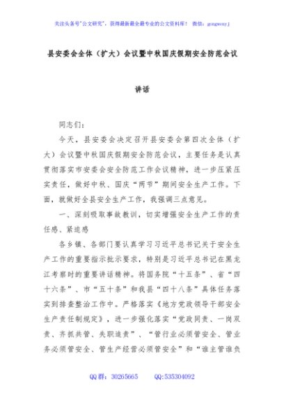 / 县安委会全体(扩大)会议暨中秋国庆假期安全防范会议讲话