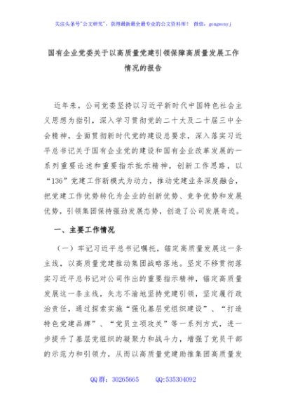 / 国有企业党委关于以高质量党建引领保障高质量发展工作情况的报告
