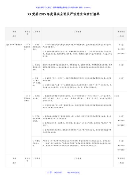 / XX党委2025年度落实全面从严治党主体责任清单