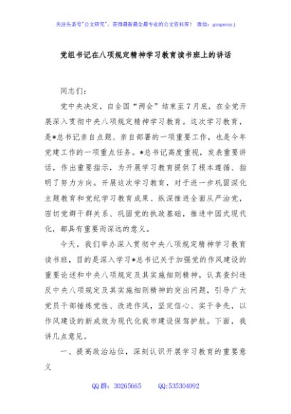 / 党组书记在八项规定精神学习教育读书班上的讲话