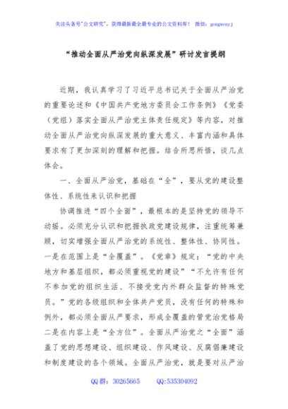 / “推动全面从严治党向纵深发展”研讨发言提纲